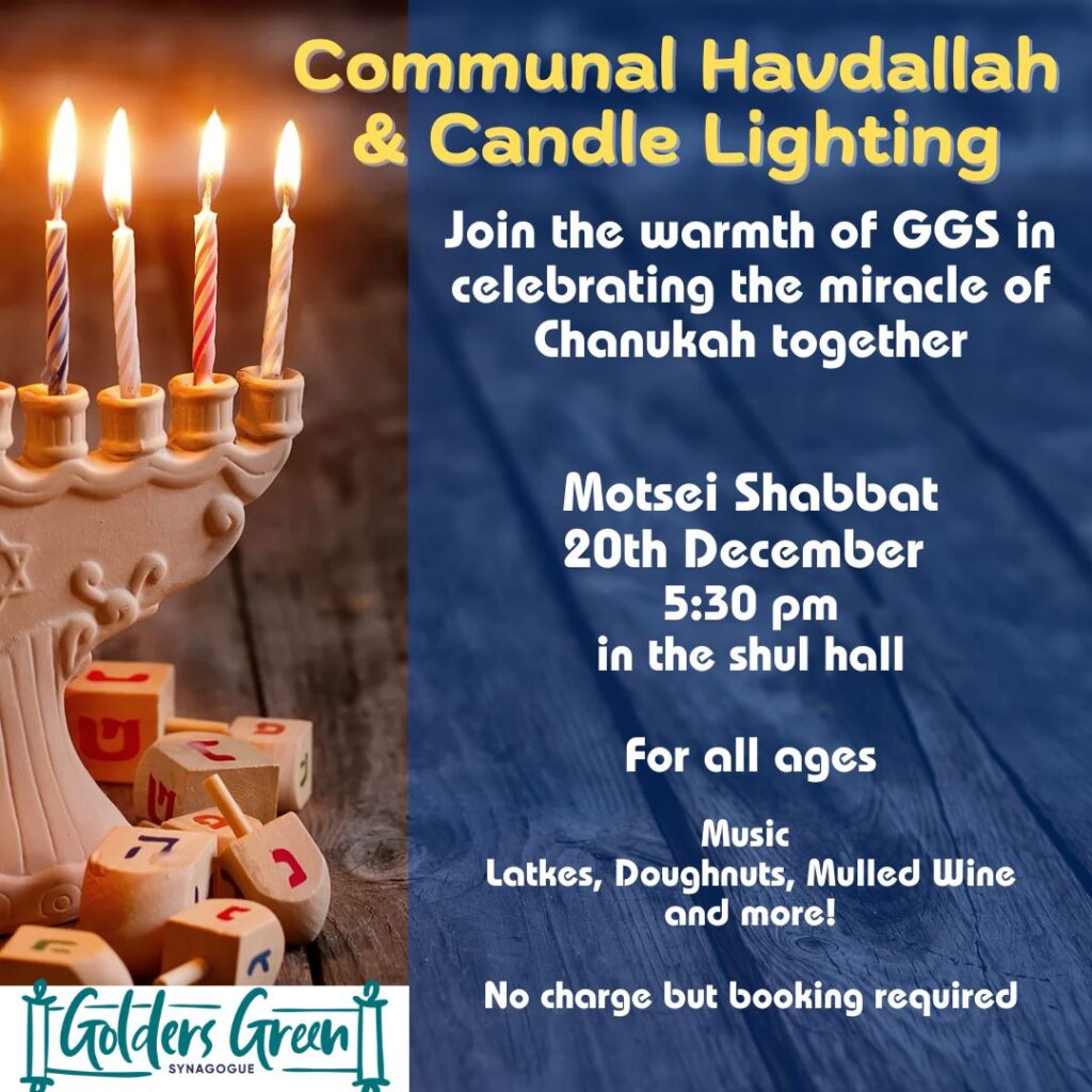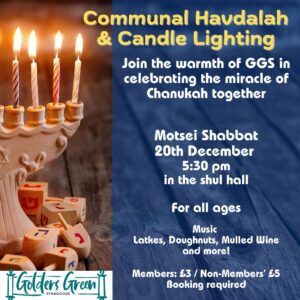 We look forward to celebrating Chanukah with the community on motsa’ei Shabbat, 20th December. Please join us for communal havdallah and candle lighting!