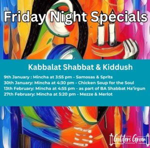 As well as our lovely Friday night Kabbalat Shabbat service, (with story time, milk and cookies for the children), our next Friday night themed kiddush – ‘Mezze & Merlot’ – will be on the 27th February