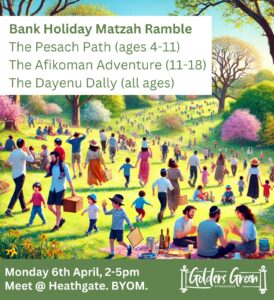 Come join us for some family fun with our Matza Ramble on Monday 6th April from 2pm to 5pm on Hampstead Heath extension (at the Heathgate entrance).  There’ll be a ‘Pesach Path’ activity for 4-11 year olds, an ‘Afikomen Adventure’ for the youth (11-18) and the Dayenu Dally for all ages!