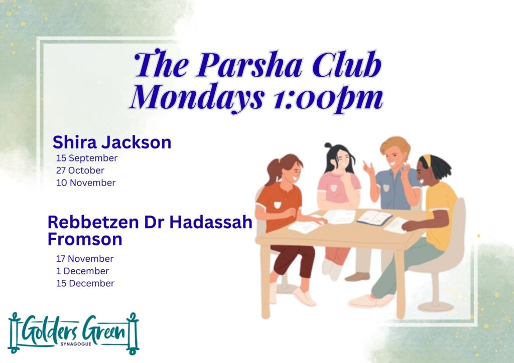 Please join us for our final Parsha Club on Monday 15th December from 1pm to 2pm led by Hadassah Fromson kindly hosted by the Zinkins.