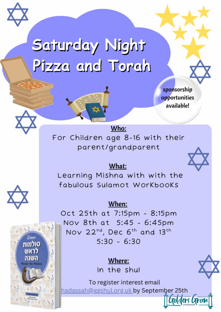 For parents and children (aged 8-18): This is a fantastic opportunity to spend meaningful time together while exploring the richness of Torah and engaging in textual study. The next session is motsa’ei Shabbat 8th November from 5:45pm to 6:45pm